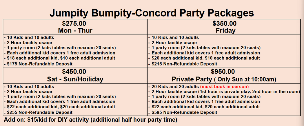 - If you would like to stay extra time after your party, please check the availabilities and pricing with our party coordinator prior to your event. It is usually NOT available on the date of your party.