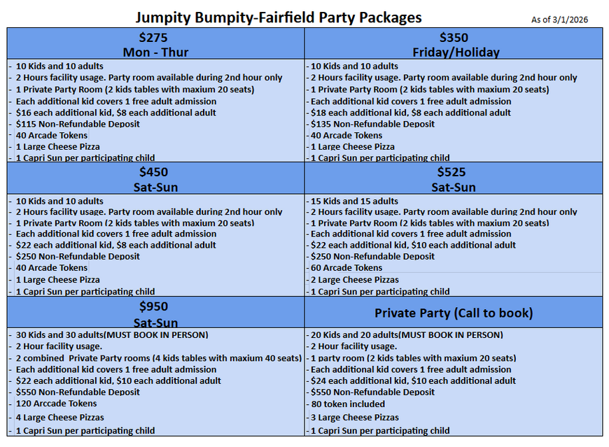 Jumpity Bumputy Party Prices