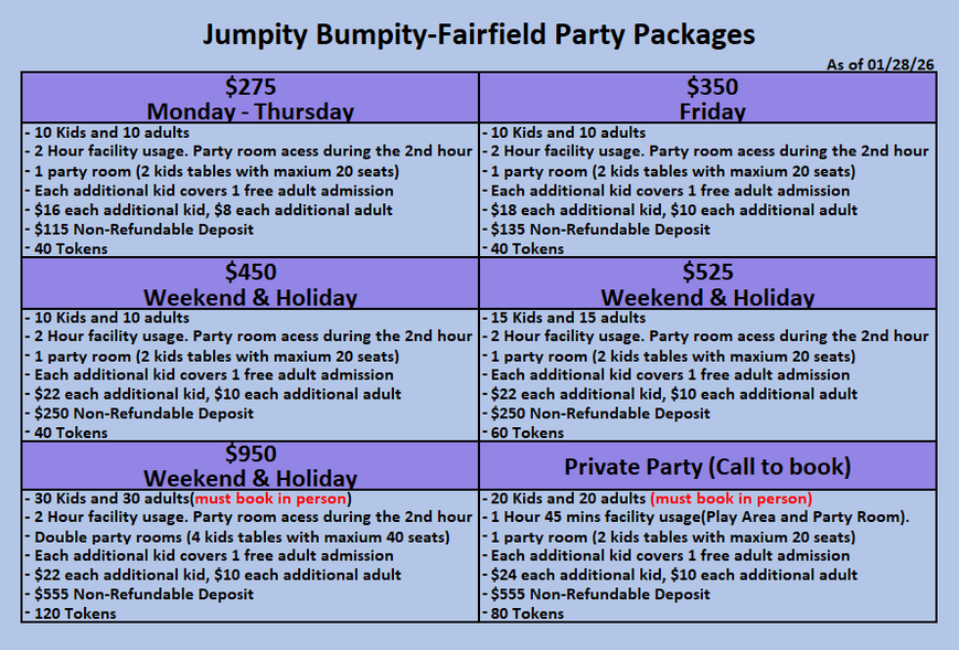 - Each party includes 2 hours of facility stay. Party room is guaranteed for the last hour during your stay (but it could be available sooner).
